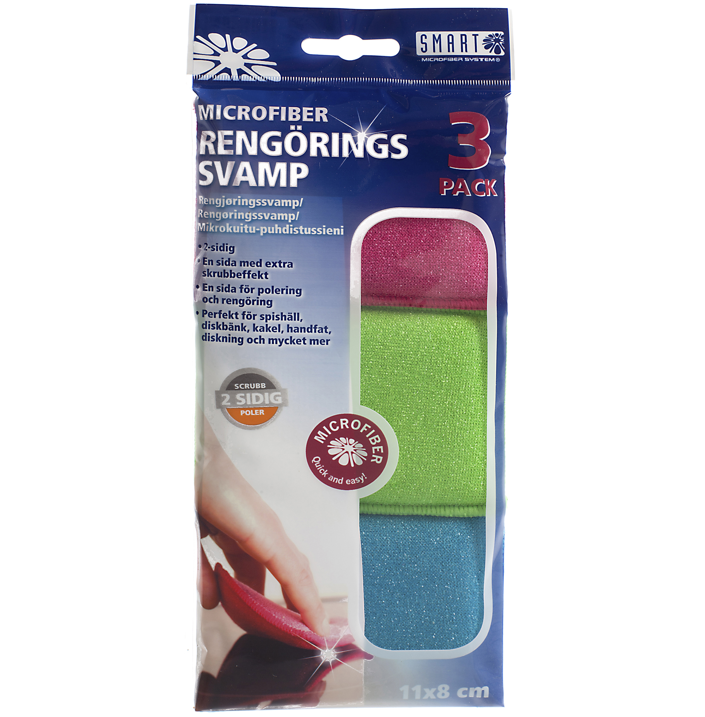 Rengöring: Vrid ur i varmt vatten. Mjuka sidan är för lättare rengöring och skrubbsidan för tuffare rengöring. Lätt att vrida ur. Obs! Använd ej skrubbsidan på plexiglas eller plastytor.